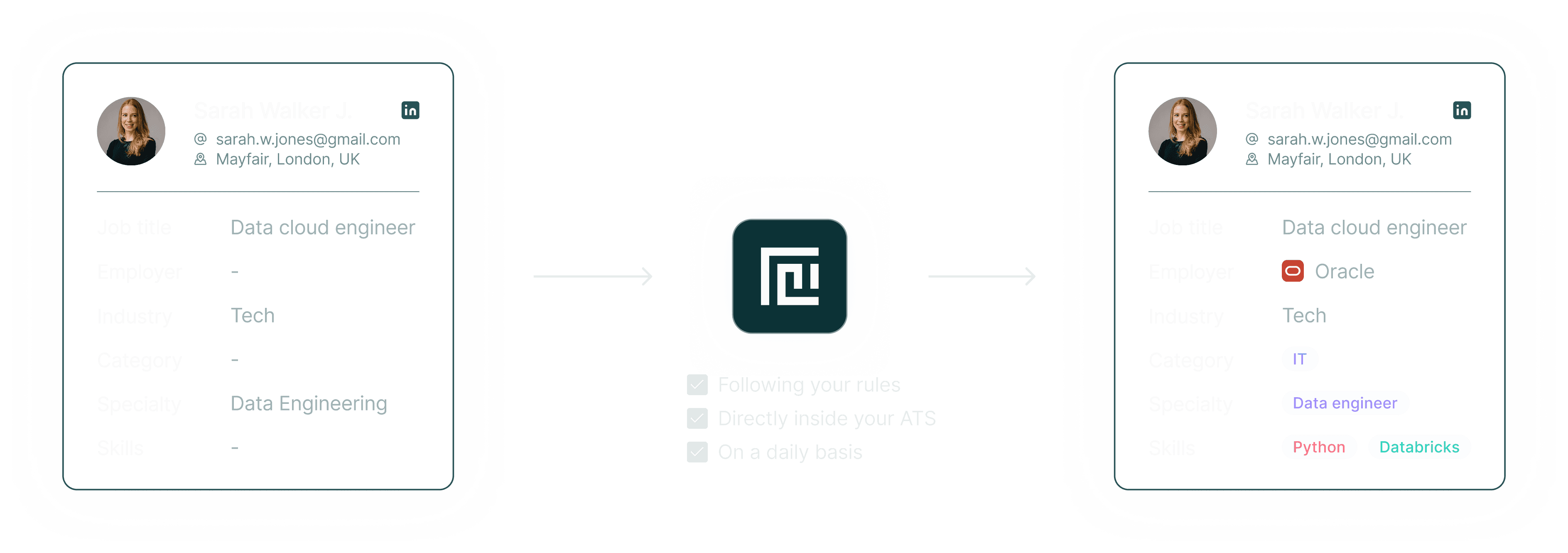 Daidalo enriches profiles using continuously refreshed data signals and updates records only when meaningful changes are detected. This ensures your ATS reflects current roles, employers, skills, and experience — not outdated snapshots.